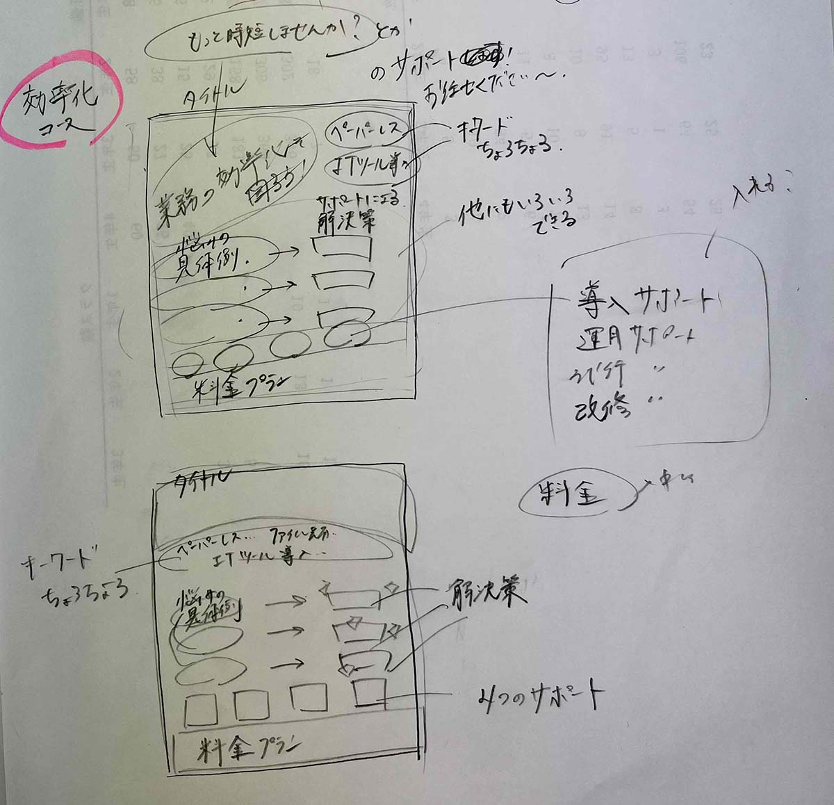 要素(提供するサービスのこと)を詰めることに頭がいっぱいになり、肝心なNPウォンツさんらしさを忘れていました。NPウォンツさんらしさというのはアナログさ、人と人のつながりを大切にしているところです。提出したラフにはサービスのことしか描いてありません。それに、リード文や飾りに文字量を指定しないとデザイナーに伝わらない!