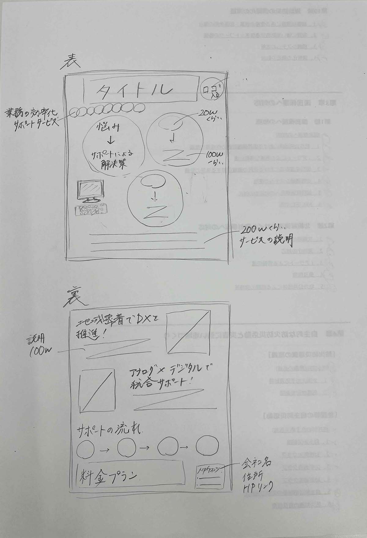 チラシはA3で作ることになり、表には二つのサービスについて紹介し、裏にはサポートの流れなどを入れました。無事にチラシ案が完成して、とりあえずホッ。